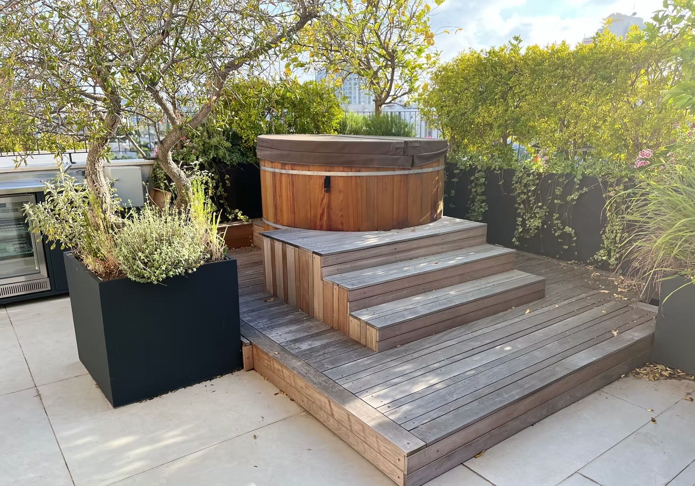 הוט טאב מעץ יכול להוות נקודת מוקד מרהיבה בכל גינת גג, ובשילוב עם שאר המוצרים שלנו – אדניות מעוצבות, ריהוט גן מעץ וגינות גג בתכנון אישי – תקבלו מרחב חיצוני שהוא ממש עולם אחר.