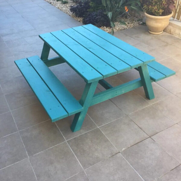 ריהוט גן מעץ - שולחנות וספסלים - מעוצבים בהתאמה אישית ובעבודת יד במפעל שלנו, כחול לבן, ובאיכות הגבוהה ביותר.